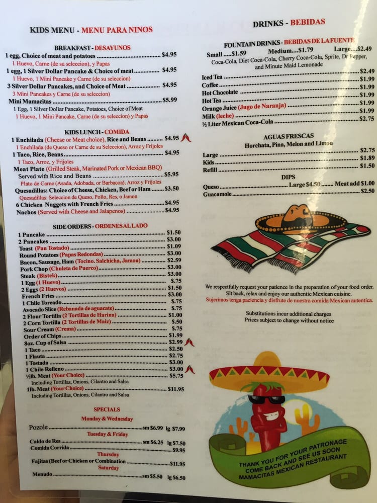Start your day with their Huevos Rancheros, where two eggs are gracefully paired with zesty red or green salsa, or savor the comforting Breakfast Burritos, filled with options like Mexican sausage or ham. The hearty Mamacitas Plate showcases a delectable assortment of enchiladas, a chile relleno, and more, promising a fiesta on your plate.